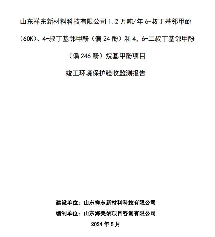 根據《國務院關于修改〈建設項目竣工環境保護管理條例〉的決定》(國務院令第682號),以及環保部《關于發布<建設項目竣工環境保護驗收暫行辦法>的公告》(國環規環評[2017]4號),現將山東祥東新材料科技有限公司1.2萬噸/年6-叔丁基鄰甲酚(6OK)、4-叔丁基鄰甲酚(偏24酚)和4,6-二叔丁基鄰甲酚(偏246酚)烷基甲酚項目竣工環境保護驗收報告(包括驗收意見)公示如下: